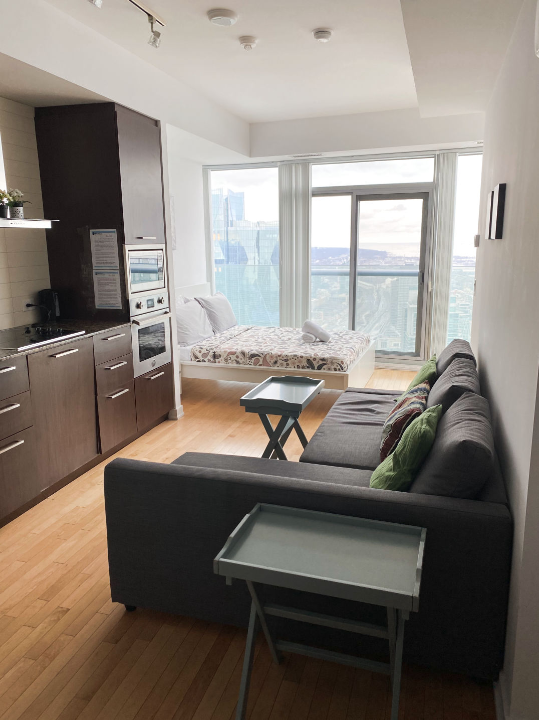 Light & airy high-rise studio flat located in the heart of the vibrant and creative area of Entertaiment District offering an amazing panoramic and ever changing views over the city and the lake on Ontario. This beautiful studio offers peace and tranquility to unwind at the end of a busy day.